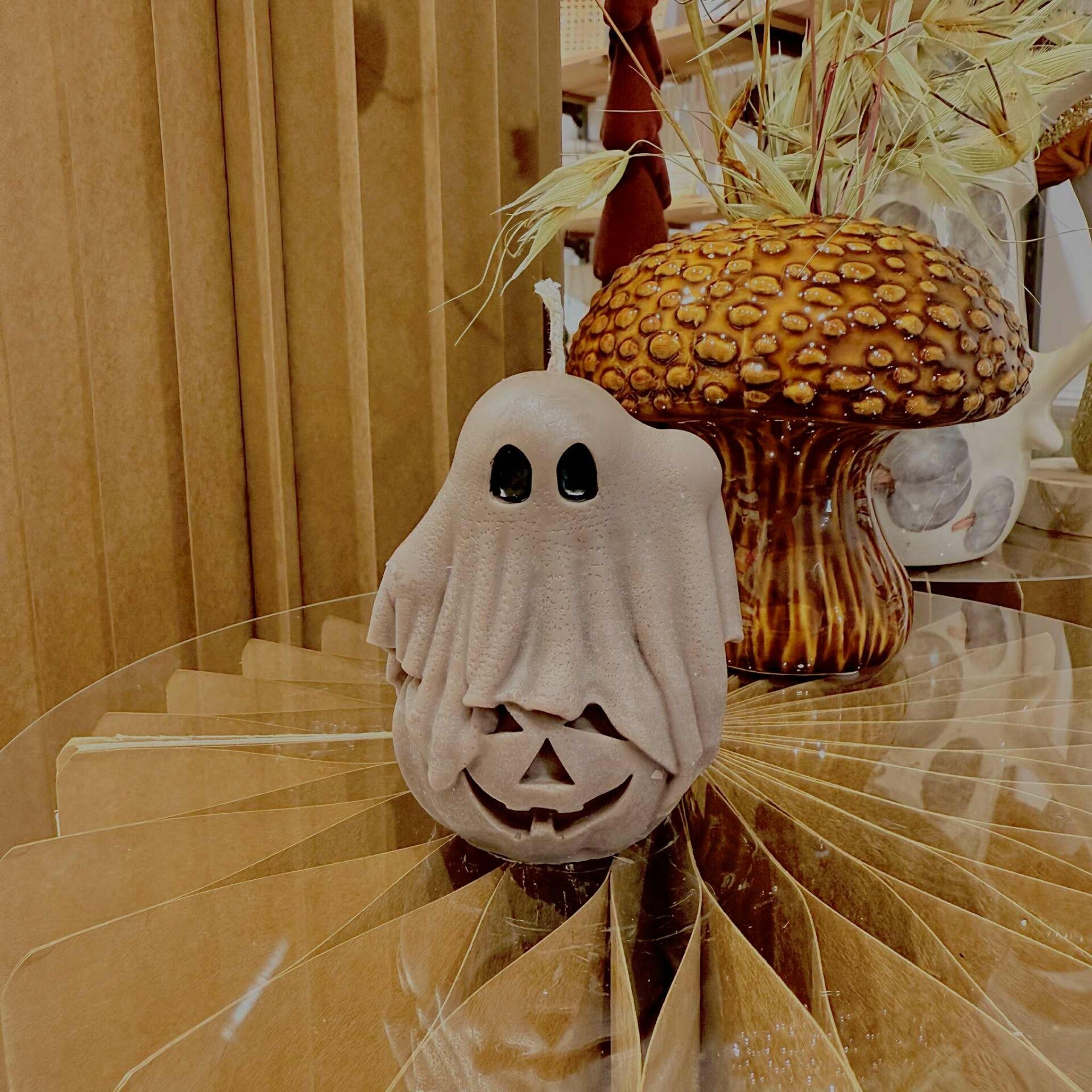 Avec ses grands yeux noirs brillants, son drap flottant et sa citrouille sculptée en guise de sourire, elle est l’alliée parfaite pour une déco d’Halloween à la fois douce, originale et pleine de caractère.