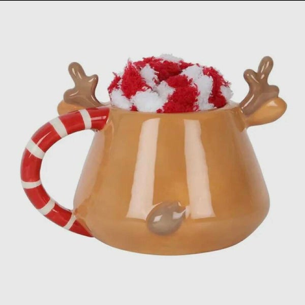 Charmant mug renne façon Rudolph avec bois en relief, détails peints à la main et anse rayée festive. Sa forme large est parfaite pour des boissons généreuses. Vendu avec une paire de chaussettes moelleuses rayées rouge/blanc/vert. Un cadeau chaleureux et super mignon pour les fêtes.