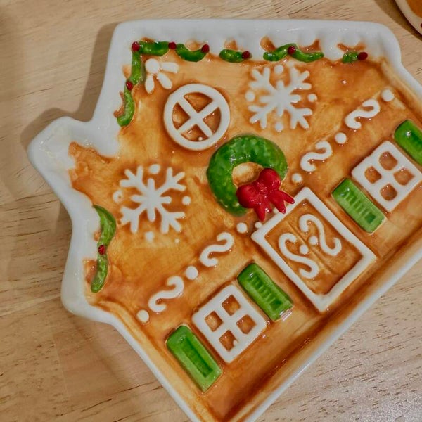 Craquez pour cette adorable coupelle en forme de maison pain d’épices, décorée de détails en relief : fenêtres gourmandes, flocons sucrés, guirlande festive et couronne verte avec son petit nœud rouge. Parfaite pour y déposer bijoux, clés ou petites douceurs, elle apporte instantanément une touche chaleureuse et magique à votre intérieur.